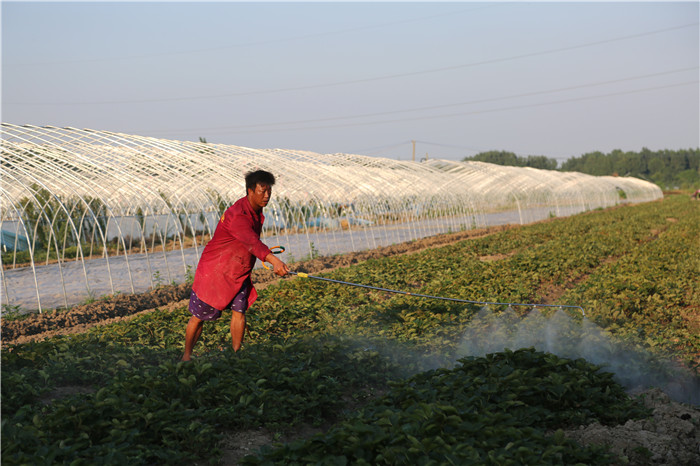 阳光从西侧照过来,投在佘扬付黝黑的皮肤上,上身一件红色长袖大褂,下身一条深蓝色短裤,他赤着脚,弯着腰,一手牵引农药管,一手持紧喷灌杆,尽可能将给每一株草莓苗“吃上药”,以防黄萎病在草莓棚里滋生蔓延。