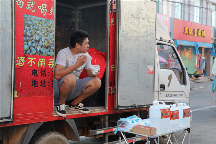 就这样,办证的事情被搁置下来,最初酿的那一批酒虽然已经发酵却无法再进行售卖。朱正福和黄海银商量后决定先去菜市场做做宣传,慢慢等证件办下来。两个人凑钱买了个白色二手货车,里面装着平时宣传用的酒,摆摊的小桌椅。货身印有巨大的“陈氏粮食酒业”标语,这是他们找县城里一家广告公司帮忙设计的,自己再去给车子上了漆,顺带印了一千张名片。因为没钱租菜市场摊位,他们每天四点出发提前去占位,他们想“必须得去早些,你晚了总不能去和那些卖菜的大爷大妈抢摊位”等到天亮了菜市场人多了,他们就把车顶的喇叭打开,把桌椅摊开,把酒倒进一次性杯子里让路过的人品尝。