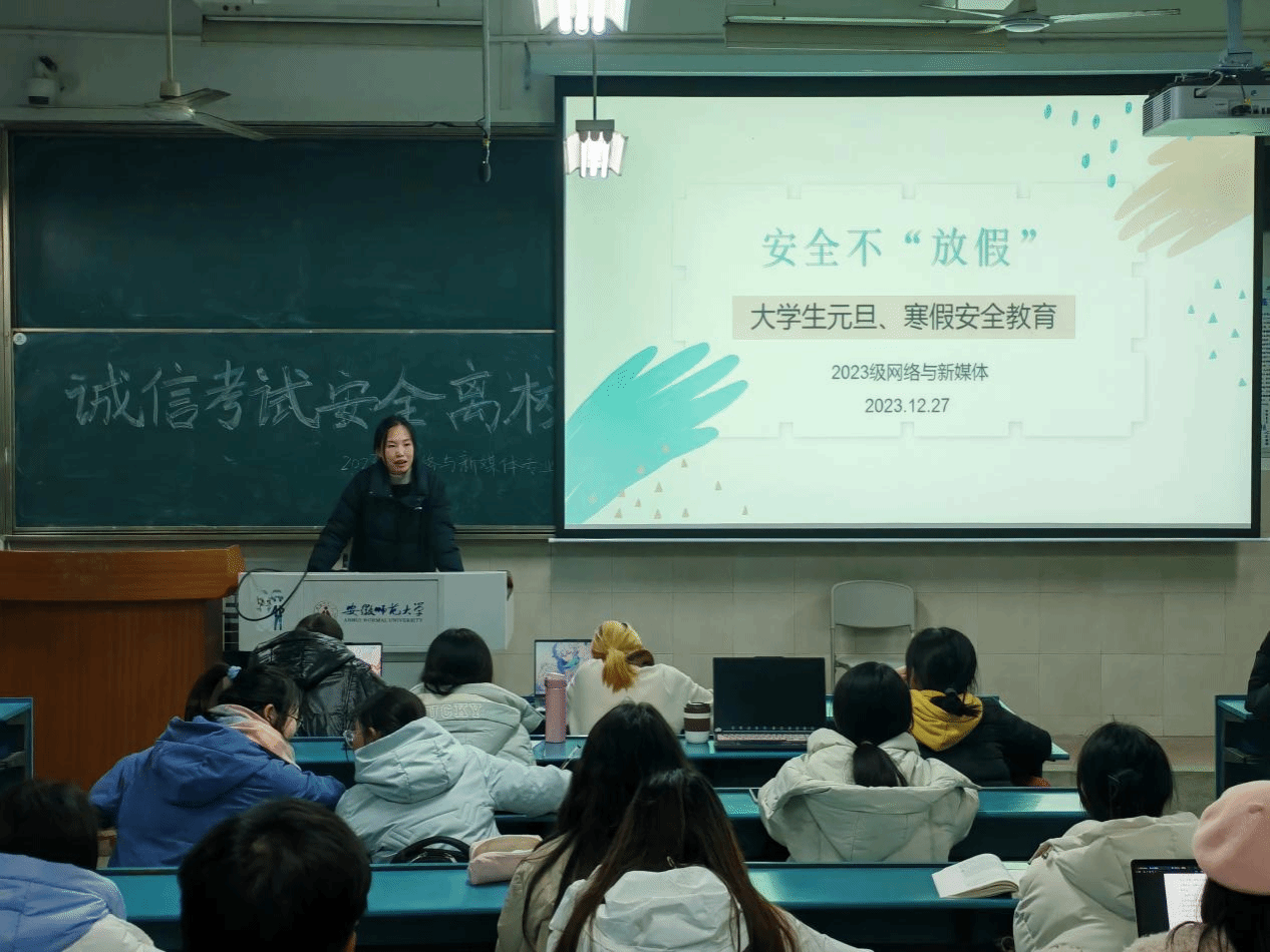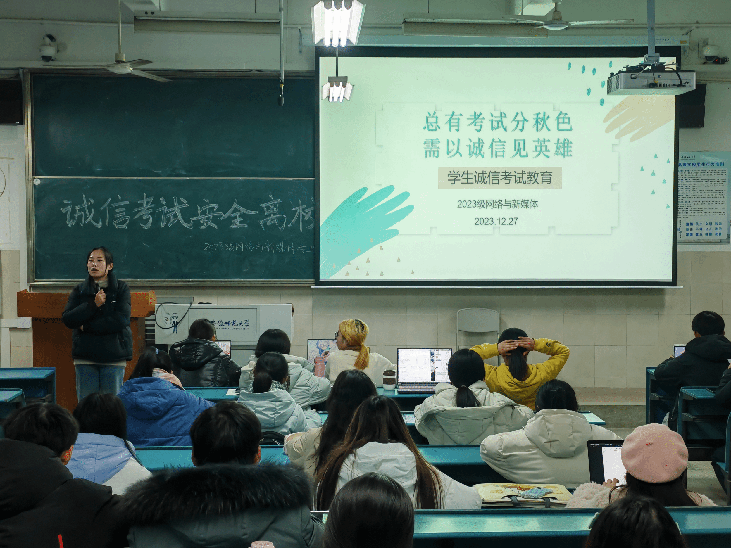 为保障学生期末考试有序进行,进一步做好寒假安全教育工作,12月27日晚,2023级网络与新媒体专业于教学楼2040304开展了“期末诚信考试与假期安全离校”主题班会。此次班会由辅导员汪笑笑主持,23级网新专业全体同学参会。
