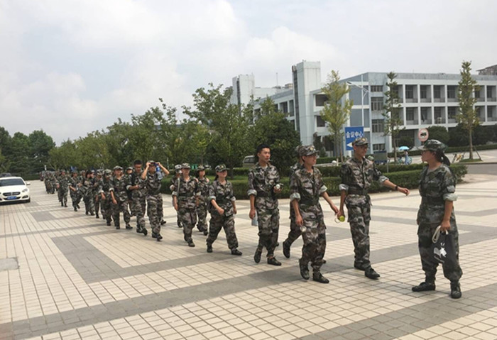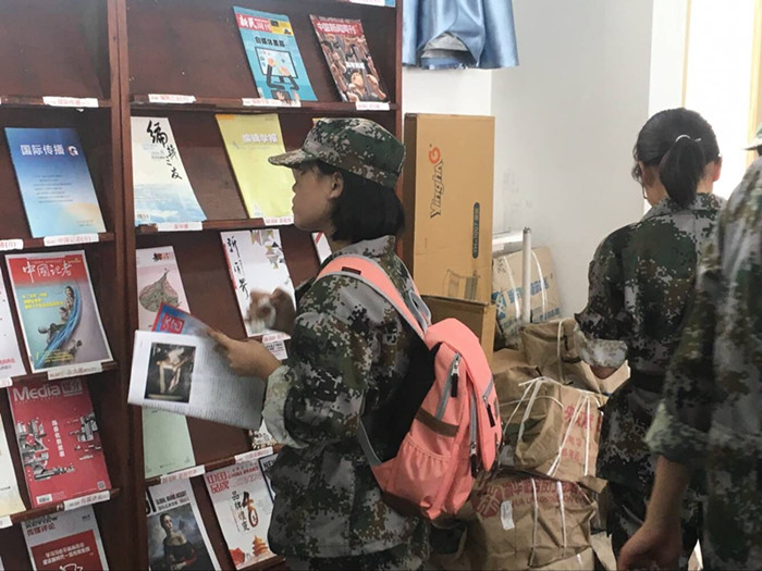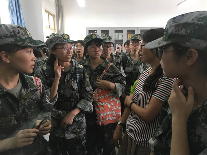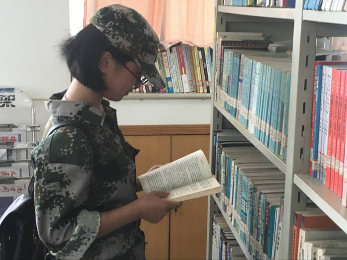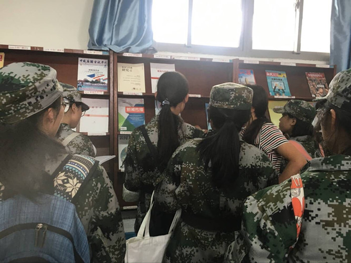 新生们完成上午的军事训练后,立即开拔前往资料室参观。坚实的身体、饱满的精神中蕴含着求知的渴望。在军训小队长李美芬、徐柏涵的带领下,井然有序地迈向图书资料室。