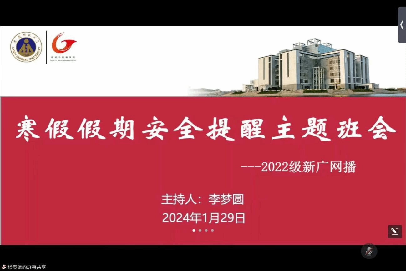 为提升学生假期居家安全意识,增强学生自我防范和自我保护能力,引导同学们度过一个充实、安全、有意义的寒假,2024年1月29日晚,2022级新闻学、广告学、网络与新媒体及播音与主持艺术专业召开寒假假期安全提醒主题班会。本次会议由辅导员李梦圆主持,2022级新广网播专业全体同学参会。