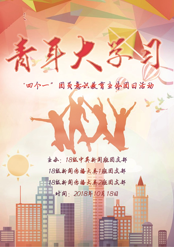 2018年10月18日,18级新闻传播学类一班、二班和中英新闻班的同学齐聚2010105阶梯教室,共同开展第一次集体团建活动。活动由中英新闻班曹慧子同学主持,由一班团支书王瑾、二班团支书龙琤、中英新闻班团支书翟鲁联合主持。活动的主题是:“改革开放四十年,我与改革共成长”和团员“四个一”教育。