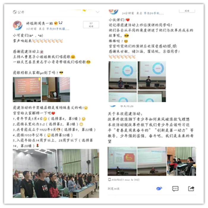 据悉,2018级新生在班级团支书的动员下,积极响应,广泛参与。设计宣传海报两张,记录活动新闻稿数篇,发布活动微博数十条、撰写心得体会百余篇,在金黄的秋季刮起了一阵红色的团建暖风。