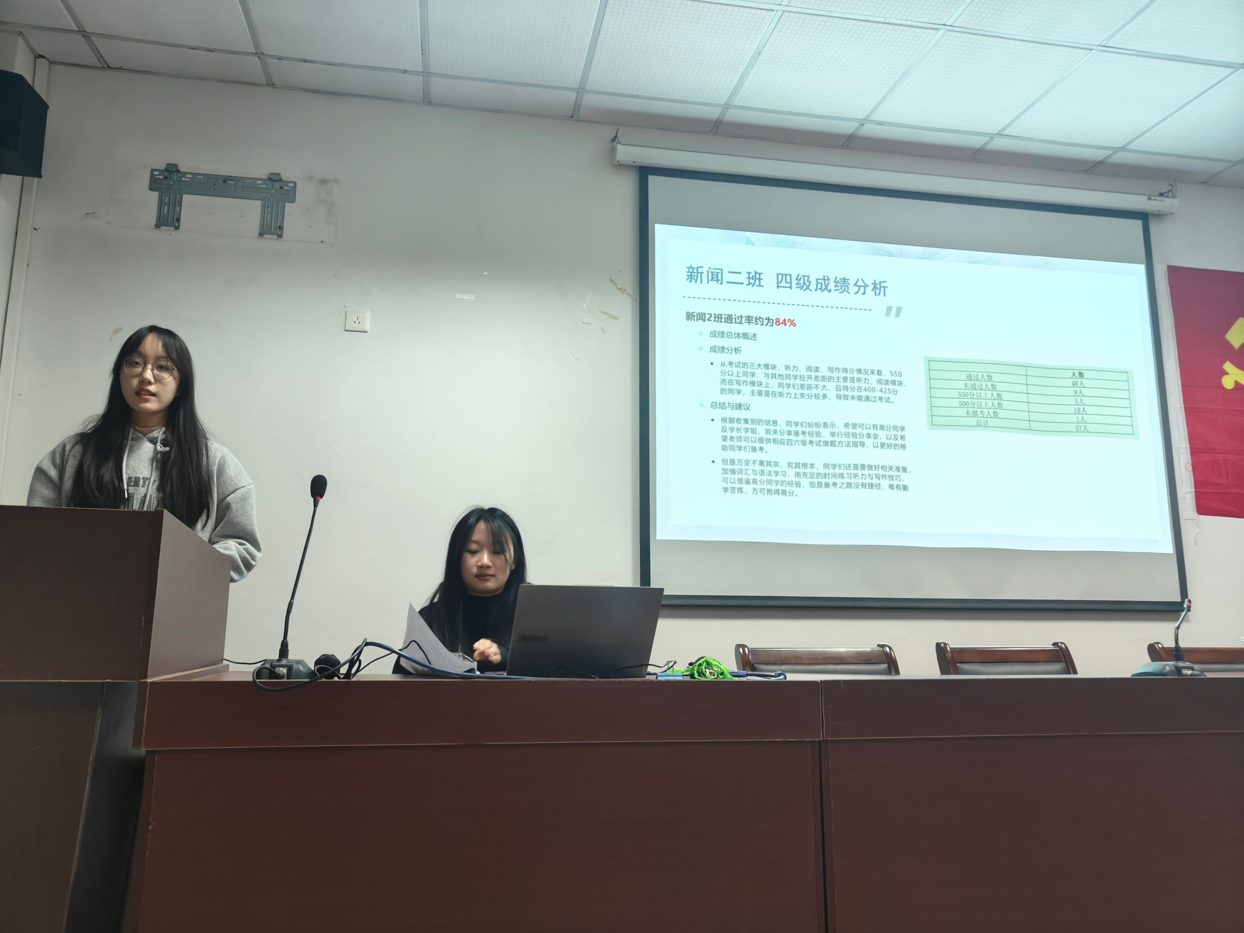 接着由学习委员唐冠男为同学们分析二班四级考试情况,新闻二班四级通过率高达84%,且未通过的同学多在听力部分失分,之后会安排四级考的609高分的夏杨同学进行经验分享,争取大家共同进步。