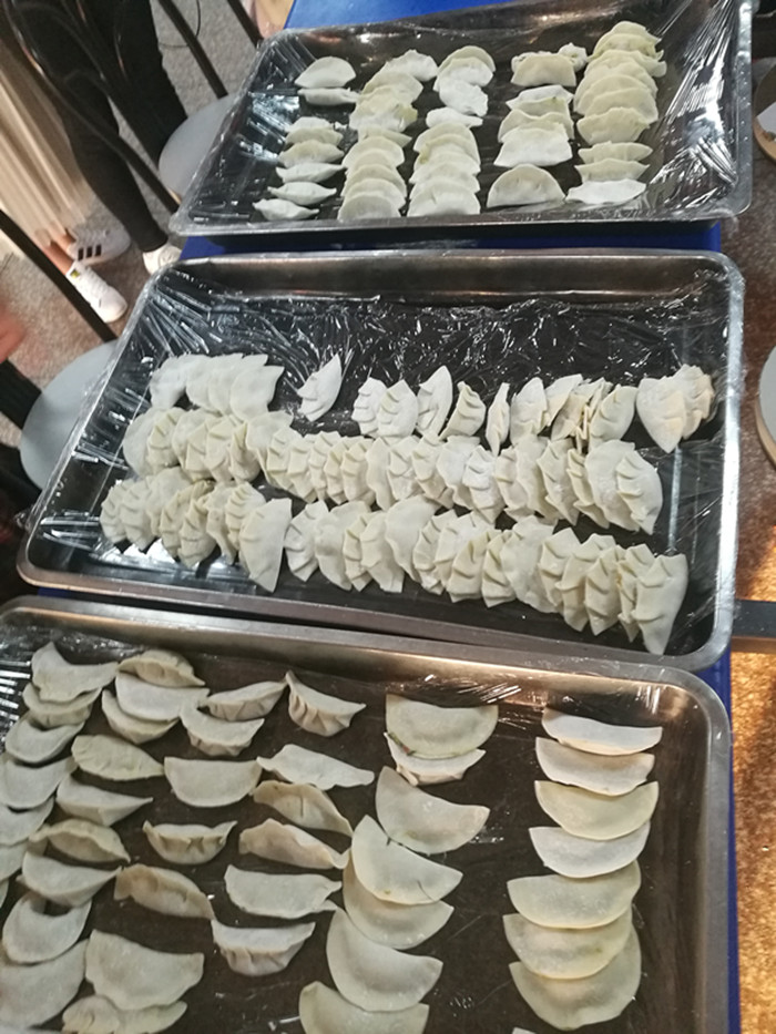 活动开始前,班委们开始着手准备桌椅和包饺子的必备材料。随后,同学们陆陆续续地赶来,迫不及待地撸起袖子,拿起饺皮和肉馅小心翼翼地包起来。不少同学大显身手,包出的饺子外型别出心裁、尽显智慧;不会的同学,在大家的互帮互助下,也包出了自己独特的作品。本次活动以团小组为单位,分为六组同时进行,六组同学的作品各具特色,最后同学们评选出了优胜组送出奖励。