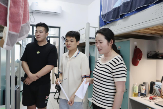 宿舍干净整洁,宽阔明亮,有的寝室打造了小型运动空间,摆放哑铃等健身器材;有的寝室设置了照片墙,记录寝室日常生活;有的寝室书香四溢,学习氛围浓厚;有的寝室简洁大方,天然去雕饰。大多数寝室都在明显位置张贴寝室管理规章制度,所有寝室都做到了规范用电用水,没有存在明显的安全隐患。崔老师在走访中和同学积极沟通,热切交流,夸赞不同寝室的风格,肯定学生热爱生活的态度。