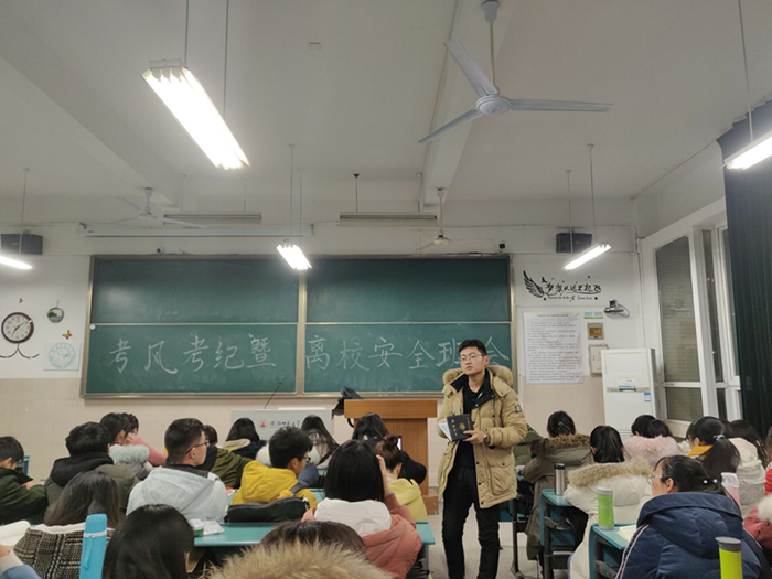 12月26日晚,18级新闻传播学类同学在行知楼2050302召开考风考纪暨离校安全班会。班会由辅导员刘熠老师组织并主持,新传大类1班、2班及中英新闻班同学均到场参加。