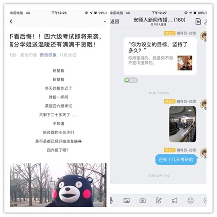 “老兵传帮带,新兵成长快”,学院心理健康部陈惠艳同学制作线上推送图片为新生考前减压。新闻传播类新生举办了学长学姐交流会,钱浩、朱玉琪不仅传递英语考试经验,还与新生联结了友谊。张宇昕同学分享自身的英语听力学习经验,引导大家重视英语听力学习。辅导员刘熠给大家介绍学习方法经验,“五官并用、早晚相见、多次复习”的方法让大家印象深刻。专业老师在期末考试前组织学生复习学期知识,本着对学生负责的态度和乐教敬业的职业精神,已过下课时间仍坚持把本学期知识梳理完毕。