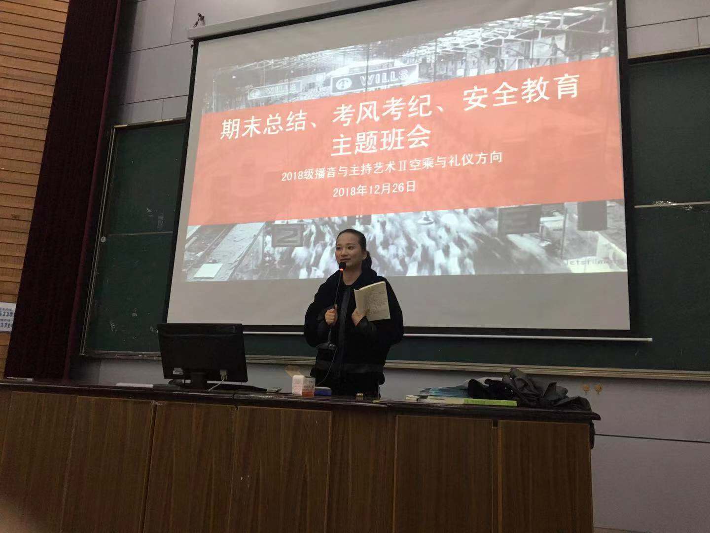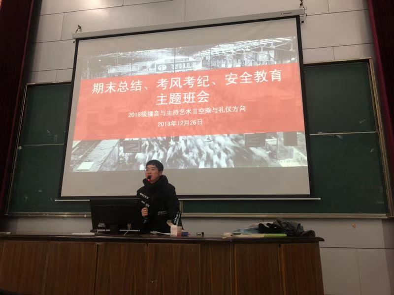 期末考试和寒假即将来临,为认真贯彻学院有关期末考试和学期末的各项安全主题教育的工作要求。2018级空乘与礼仪专业于12月26日在教学楼2010105召开了严肃考风考纪,加强安全教育主题班会,会议由辅导员王旭老师主持,专业教师疏展参加了本次会议。
