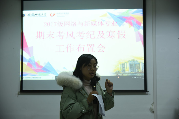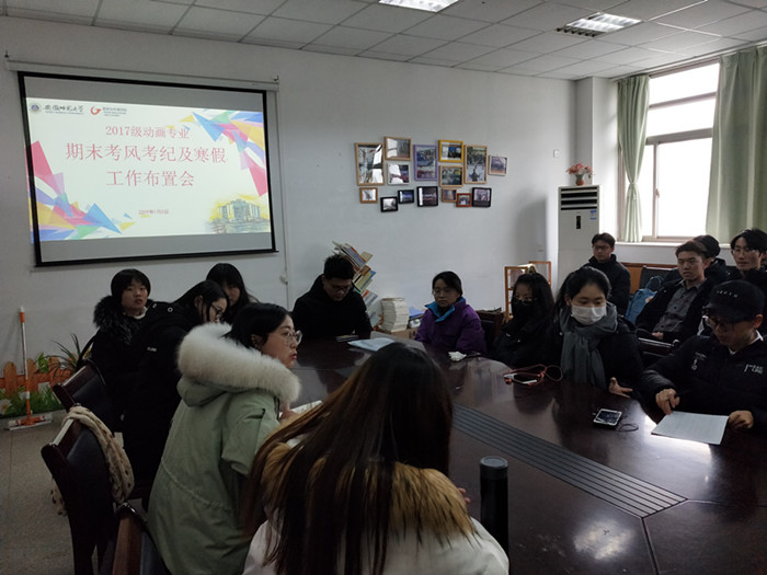 1月3日,2017级网络与新媒体、动画专业相继召开了期末考风考纪及寒假工作布置会。班会由辅导员张雁主持,全体学生参加。