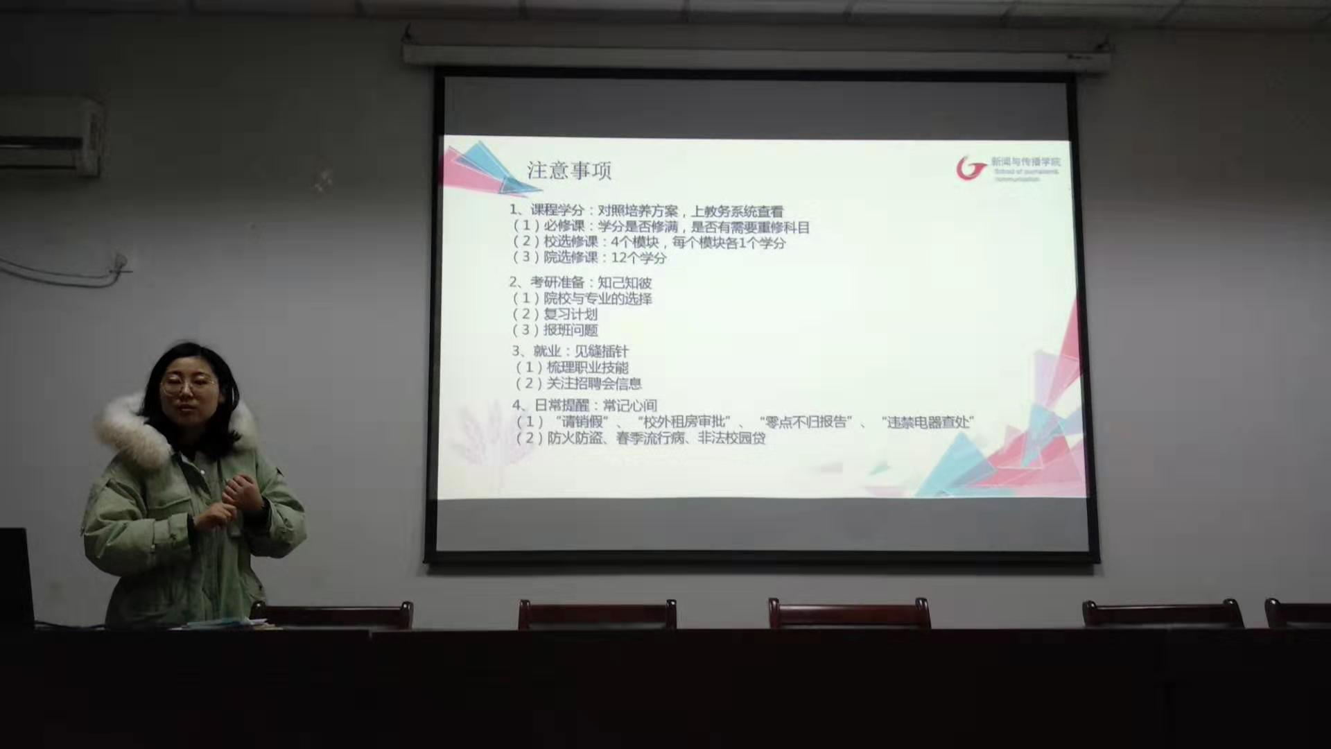 会上,张雁老师针对考研计划给同学们打防御针。有考研想法的同学应当提前做好准备,选择意向学校及专业,做好复习计划。从三月份开始要进行个人学习计划,英语和专业课时刻不能放松。此外,对于就业机会要做到“见缝插针”,梳理职业技能,关注招聘会信息,不错过身边的机会。