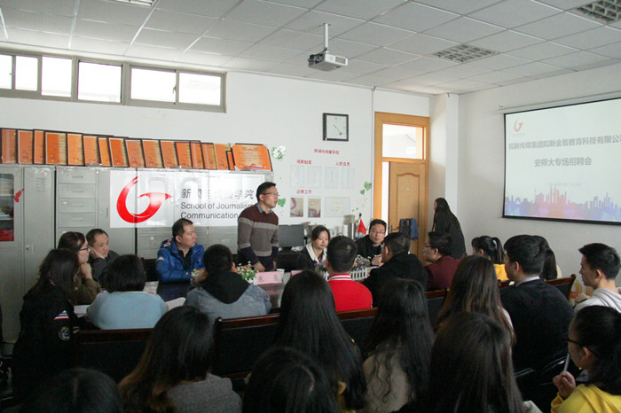 会上,各位同学积极提问,以便更加了解综合性传媒集团和国企的用人标准、招聘需求、行业现状等。简短的宣讲会之后,朱杲、乐涓与行政主管赖稹分别对应聘者进行一对一面试,使双方充分考虑公司用人要求与同学们的入职需求。下午,有意向参加今年夏季专业大实习的同学向用人单位继续了解实习要求,并同时递交简历,希望能够得到在皖新传媒实习的机会。老师们非常耐心负责地向各位同学介绍了公司录用实习生的要求,并与同学们深入交谈。
