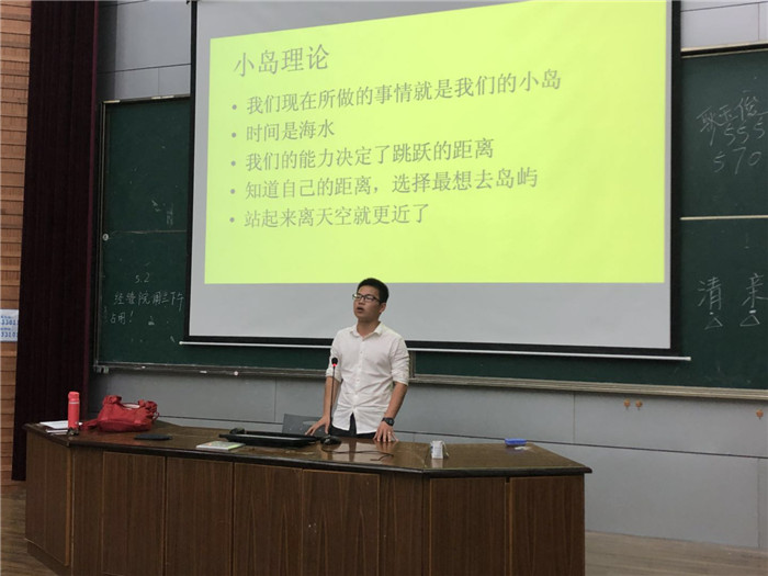 无论考研还是就业,明确自身定位都是基础,王晨介绍了就业面试过程中自己总结的小经验,对于如何能做独特的自我介绍,如何能够高效地工作等方面详细地讲解。他提出了自己在自己工作中总结的小岛理论分享给对于就业有所规划的同学:“我们现在所做的事情就是我们的小岛,时间是海水,我们的能力决定了跳跃的距离,知道自己的距离,选择最想去的岛屿,站起来离天空就更近了。”他帮助想要就业的同学们分析了实习和工作的区别,让大家提前熟悉面试流程,明确工作所肩负的责任。