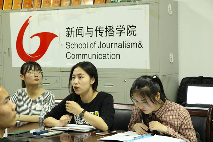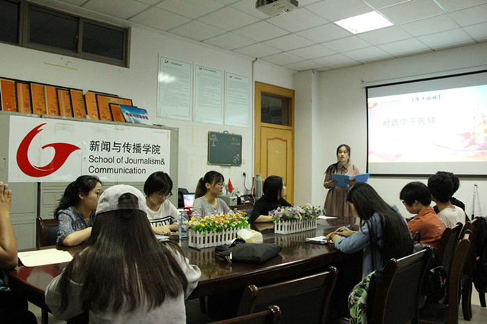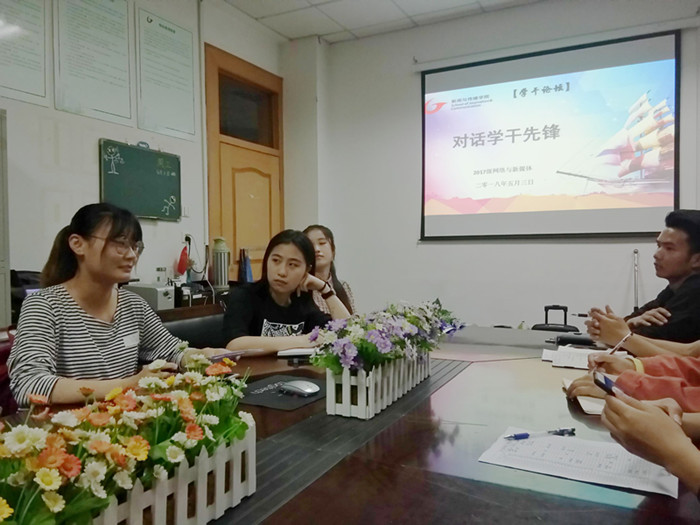 金风吐睿,锦囊探计。为加强学生骨干之间的学习与交流,5月3日晚7点,在学院楼三楼会议室,由2017级网络与新媒体专业策划并组织的对话学干先锋交流会,邀请到文学院2015级汉语国际教育专业阚薇薇,学院2015级广告专业来妤婷, 2016级网新专业杨馨艺做交流分享。辅导员老师张雁以及2017级部分学干共同参与了本次活动。