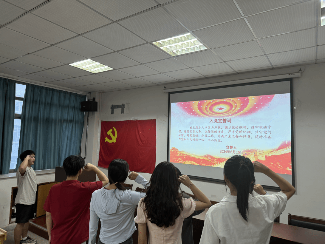 按照会议流程,预备党员邓新等8位同志进行宣誓,邓新作为领誓人,带领8位预备党员面向党旗,佩戴徽章庄严宣誓,誓词声声入耳,铿锵有力,共同立下为实现共产主义不懈奋斗的青春誓言。宣誓结束后,支部书记李梦圆老师对各位预备党员提出期望和要求,希望党员同学们可以时刻谨记自己的党员身份,处理好个人与集体的关系,牢记使命,担当起党员的的责任和义务。