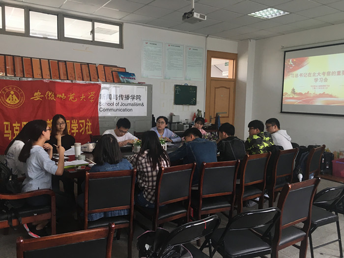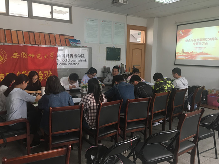 2018年5月8日下午,学院马克思主义新闻观学习社在学院会议室开展习近平总书记在北京大学考察和马克思诞辰200周年重要讲话精神学习会。学院团委副书记马星宇,辅导员张雁,社团主要学生骨干参会。