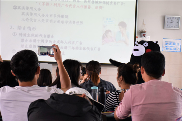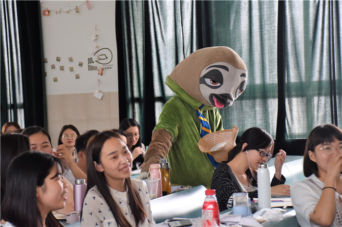 在15级广告学专业的课间中,玩偶因其胖胖的身材而夹在教室桌椅间的狭窄过道里,其不断扭动挣脱的姿势逗笑了所有人。在同学们的欢声笑语里,“舞动课间·欢乐青春”活动终于顺利完成了。活动每去到一个班级都会给一个班级的同学们带去欢笑,同学们还将现场拍摄的照片和短视频发布在社交媒体上,当活动去到17级新闻学(中英合作)的课间时,任课老师朱晓凯正在教室和同学们一起休息,他也将活动照片发在了朋友圈,将歌声、音乐声、欢笑声分享给了更多的人。