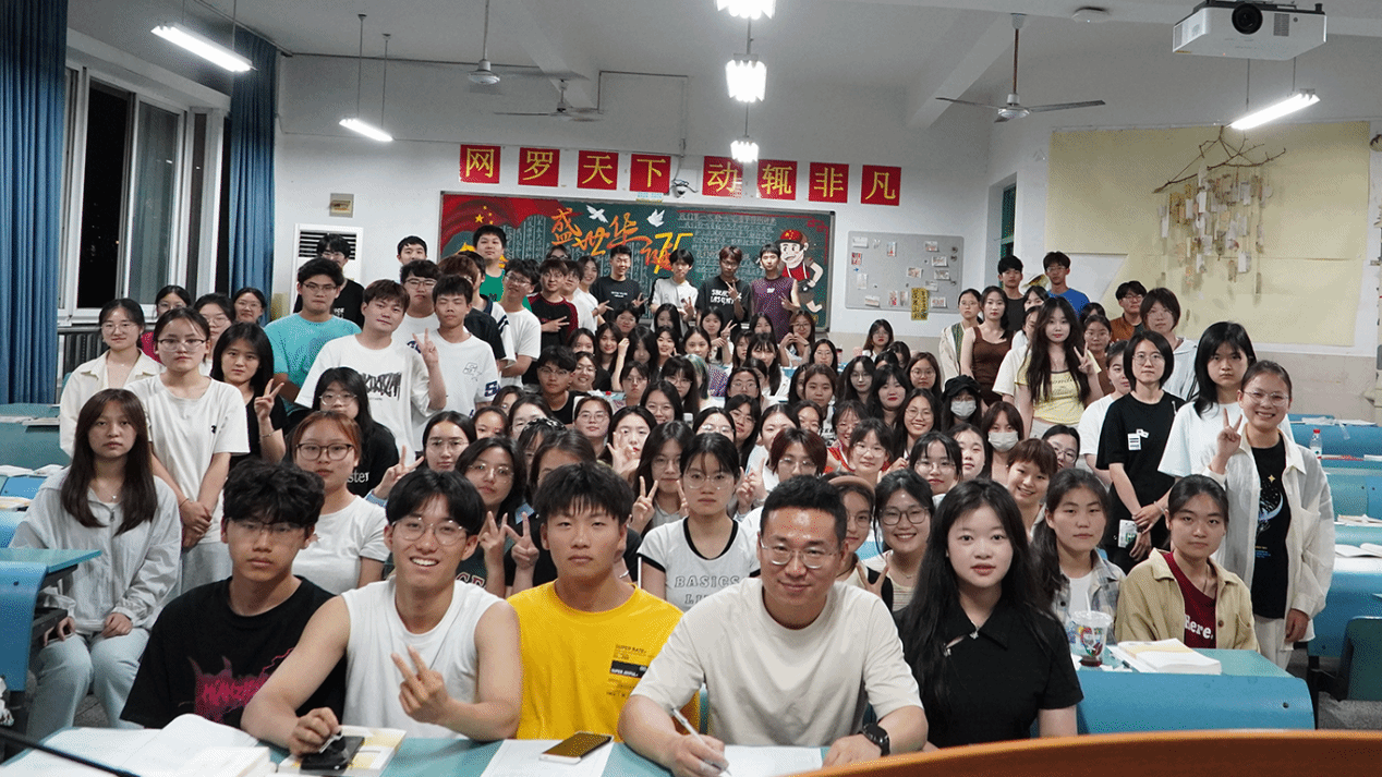 会上,马老师首先带领同学们回顾从2023年9月同学们迈入校门至今已经过去了近三百天,他说,大家在师大的时光已经度过了三分之一。于是,马老师分别用四种不同的诗句来总结同学们一学年的收获。“莫听穿林打叶生,何妨吟啸且徐行”,同学们接受了舆论的审视,坚定新闻学专业。“山重水复疑无路,柳暗花明又一村”,历经一年,大家逐渐适应平视学校生活。“坐地日行八万里,巡天遥看一千河”,同学们透视新闻专业,有了探索专业的创作能力。“不畏浮云遮望眼,自缘身在最高层”,俯视曾经走过的路,大家已经确定了更宽广的视野,包括个人发展、大学规划、专业学习等。