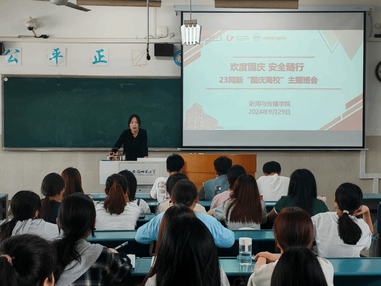 9月29日上午,2023级网络与新媒体专业在行知楼2号楼504教室开展国庆离校安全主题班会,会议由2023级网新专业辅导员汪笑笑主持,2023级网络与新媒体专业全体同学参加。