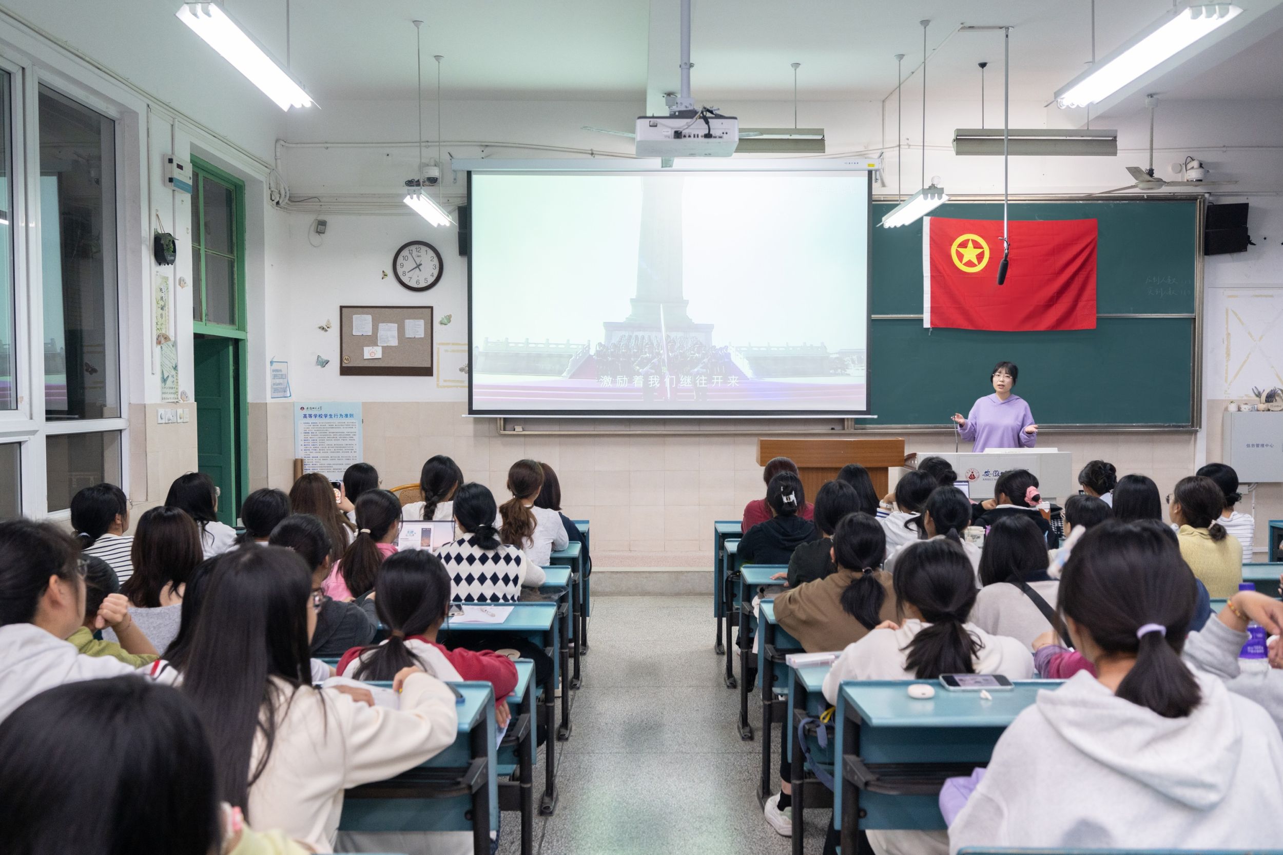活动第一项,廖一诺向全体学生说明团费收缴、使用相关内容、介绍三会两制一课和团员发展细则。随后宫鑫鑫教唱团歌,在宫鑫鑫带领下,学生们歌声嘹亮、气宇轩昂,“我们是五月的花海,用青春拥抱时代;我们是初升的太阳,用生命点亮未来”,在歌声中尽绽青春芳华。