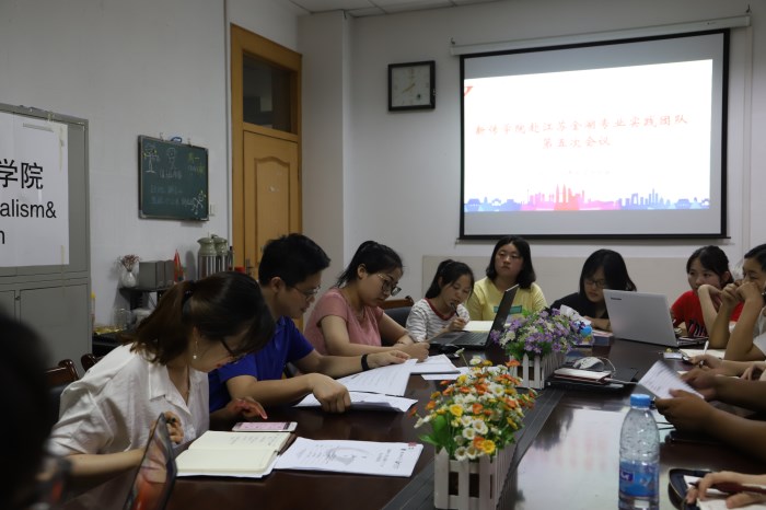 会上,新闻组的两位负责人汇报近期工作进度。负责调研乡村振兴、生态农业的组长徐晨分别列出对于金湖荷花荡及荷花节、农业技术及生态项目的采访提纲,并附上相关借鉴资料。负责调研企业改革的组长刘文潇对实践中街采的采访对象、采访主题、拍摄计划等做了重点汇报。随后,秦风对新闻组的工作进行了指导,提供了相关采访对象和采访方向,以确保团队工作在实践过程中开展。摄影摄像组则以若干优秀纪录片为例,意在通过借鉴这些纪录片来确定团队拍摄企业发展记录片、美食记录片、人物记录片等的初步构想。组长吴超说,“我们团队的纪录片如何才能做得和别人不一样,先要做到不以新闻片的形式播放出来。”技术组组长丁纪汇报了技术组已完成、半完成、未完成的三类工作;支教组组长肖芳华介绍了支教招生、课程、文艺汇演三件事的情况,具体叙述了文艺汇演的相关事宜;新媒体组组长赵柳明汇报了现在团队微博微信的推送进度,并整理指出了近年来团中央、中青网、中国大学生在线官博推送大学生暑期实践报道的报道特点。最后,后勤组组长张秋芮将团队物资购买、后勤组人员工作分配一一列出。