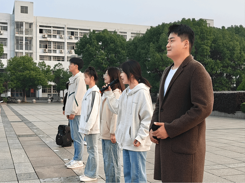 早上七时,国旗护卫队迈着整齐的步伐,英姿飒爽,目光坚定地护送国旗。升旗仪式中,全体师生庄严肃穆,面对国旗行注目礼,齐唱国歌。