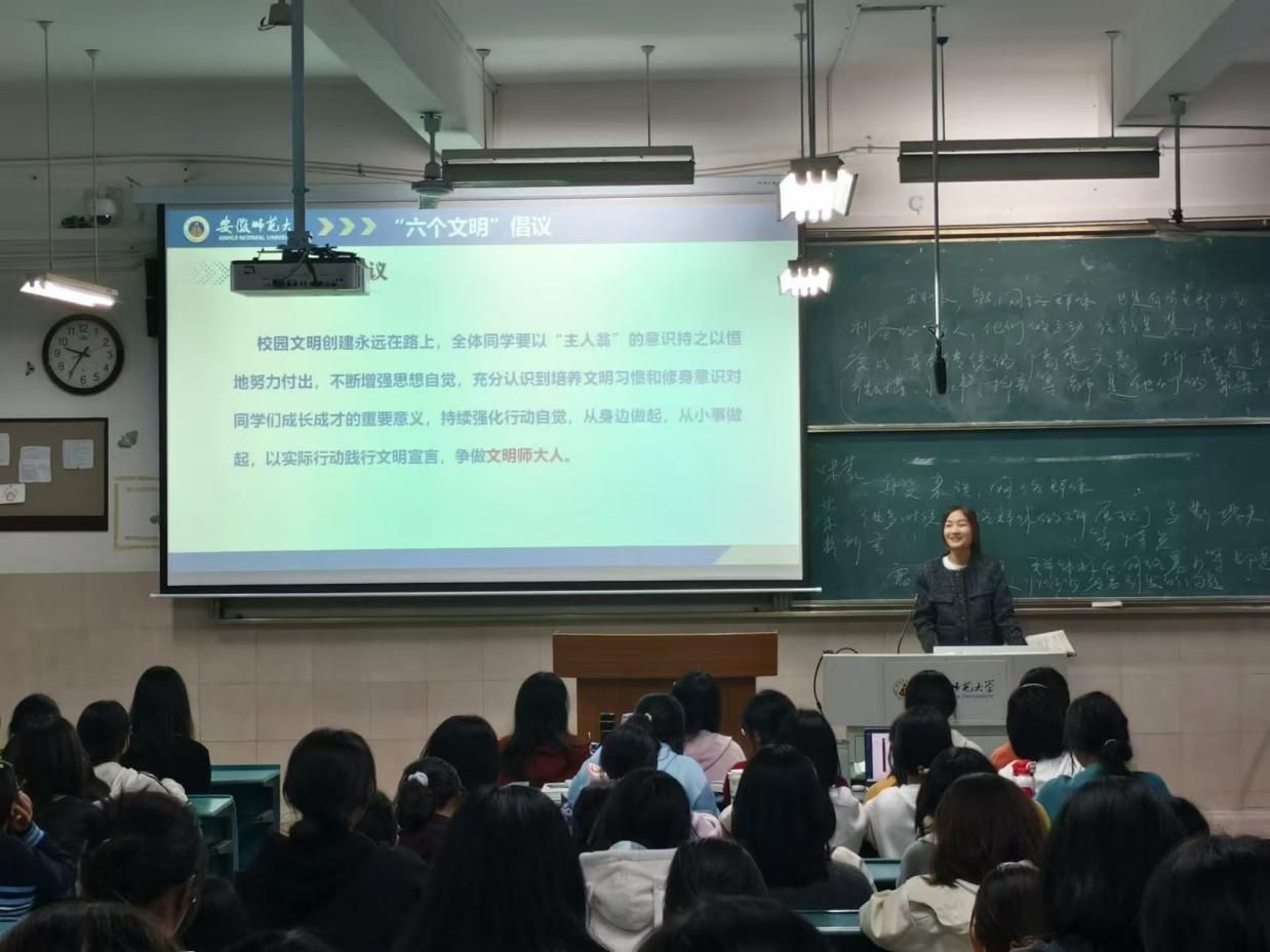 接着,郭锦怡老师对学生行为准则、遵守校规校纪方面做重点强调,作为一名大学生,要深入学习习近平总书记十六字箴言“勤学、修德、明辨、笃实、爱国、励志、求真、力行”,要做到以下四个方面:遵纪守法,弘扬正气;诚实守信,严于律己;明礼修身,团结友爱;勤俭节约,艰苦奋斗。作为一名师大学生,要严格遵守校规校纪,将“六个文明”贯彻于心。做文明师大人,展时代新风采。