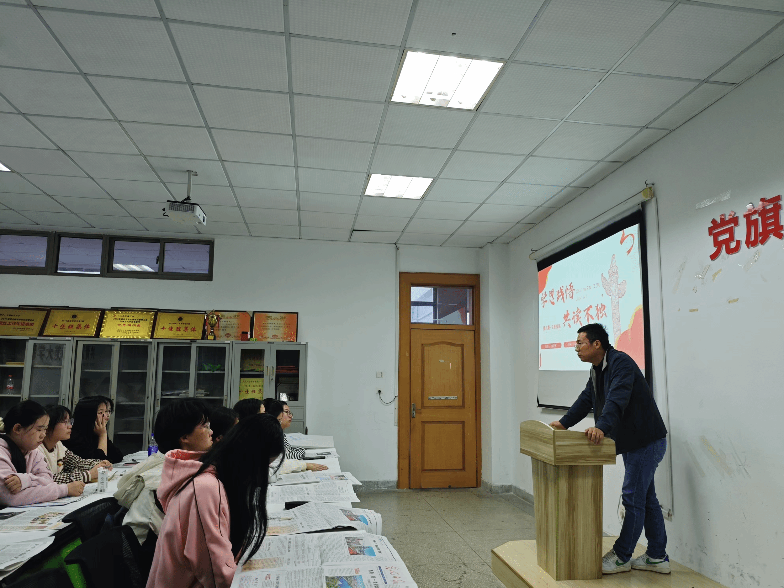 在秋意渐浓的11月5日,第八期党报共读会在学院办公楼302室如火如荼地举行。本次研读会由2023级新闻学专业2班的张嘉美同学主持,她以其独特的视角和深入的理解,引着同学们进入了一场别开生面的党报阅读之旅。辅导员马星宇老师亲临现场与同学们共读党报并做点评。