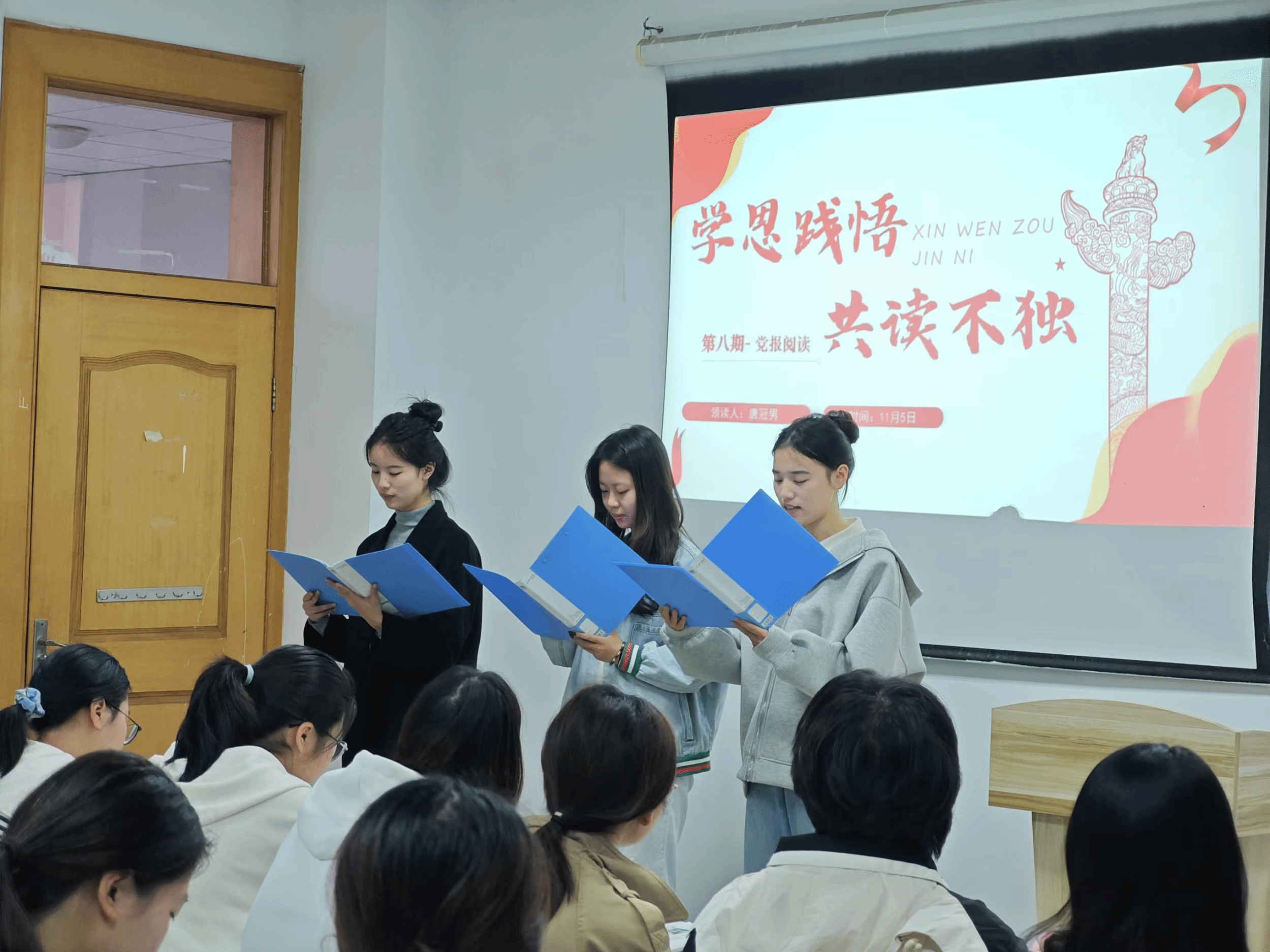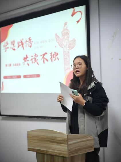 本次研读会的另一个亮点是播音主持专业的同学带来的党报文章朗诵。他们的声音饱满,情感真挚,将文字的力量转化为声音的韵律,让党报的文字在空中飘扬,激发了在场所有人的共鸣。