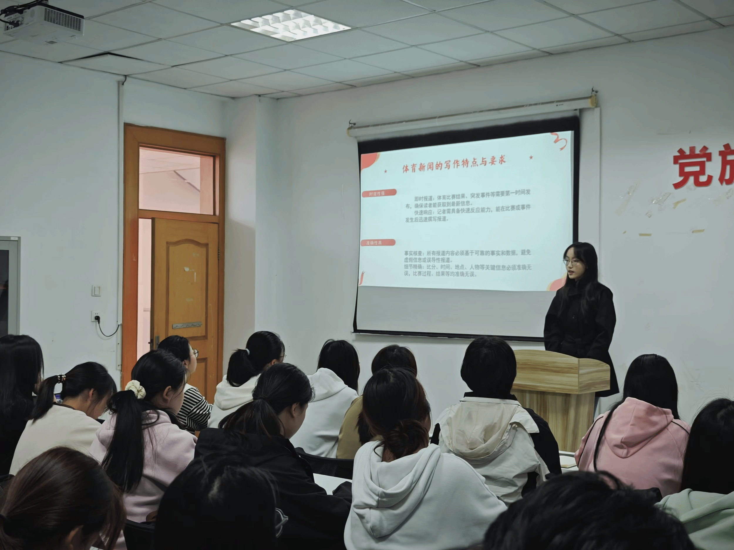 研读会的核心环节是同学们对党报文章的分享与讨论。新闻学专业的唐冠男同学分享了《12年等待,今朝圆梦——记中国女篮重夺亚洲杯冠军》一文,她深入剖析了体育新闻的叙事策略和情感构建,让在场的同学们对体育新闻的写作有了更深入的理解。紧接着,王依纯同学则解读了《共同开创新的历史——国家勋章和国家荣誉称号颁授仪式侧记》,她从新闻的深度报道和事件报道的角度,阐述了如何通过新闻传达国家荣誉的庄重与崇高,为在场的新闻学专业学生提供了宝贵的写作借鉴。