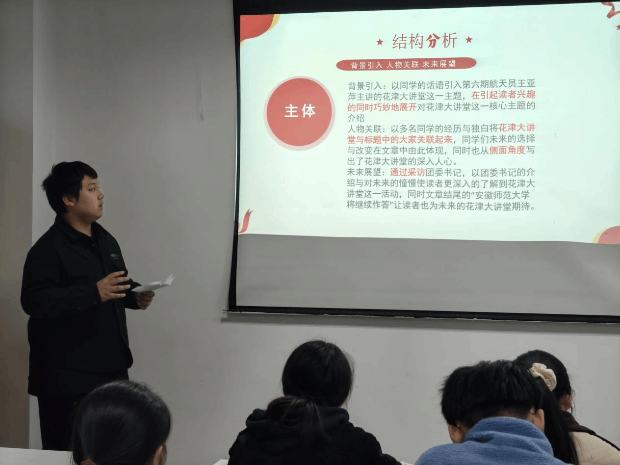 夏习嘉同学则带领大家走进由韩润喆同学撰写的《青春思政课里的“大家”与大家》,深度剖析文章架构,揭秘采访语言如何为文章添彩,传递观点与情感。随后韩润喆同学亦分享了撰写稿件的感悟,强调引导被采访者与理清脉络的重要性。