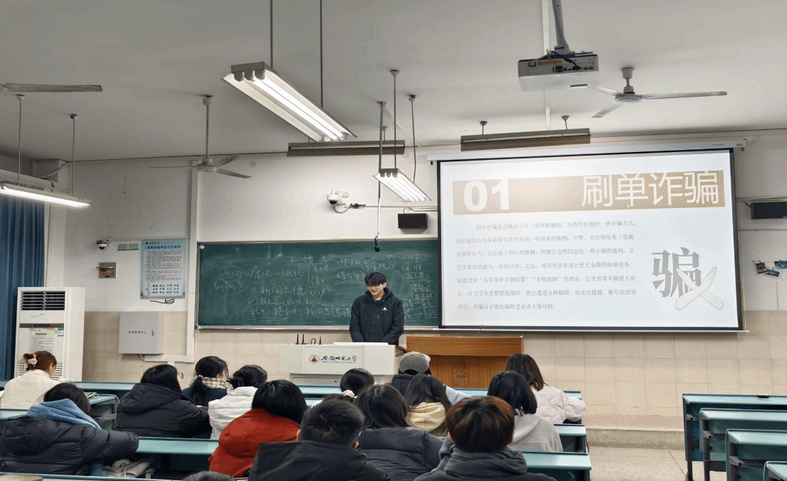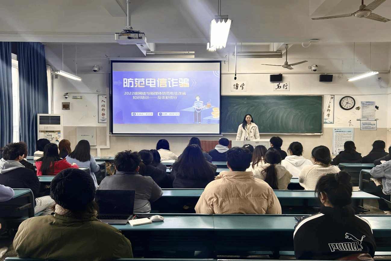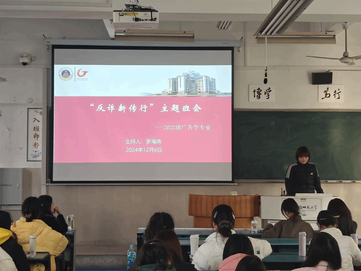 为了进一步增强大学生群体的安全意识,提升学生识别和防范诈骗的能力,2024年12月6日,2022级新闻学、广告学、网络与新媒体、播音与主持艺术专业分别开展了反诈宣传系列主题班会。本次班会为同学们提供了一个学习和交流的平台,让他们能够深入了解诈骗的各种形式和手段,掌握有效的防范措施,共同编织起一张严密的反诈骗安全防护网。