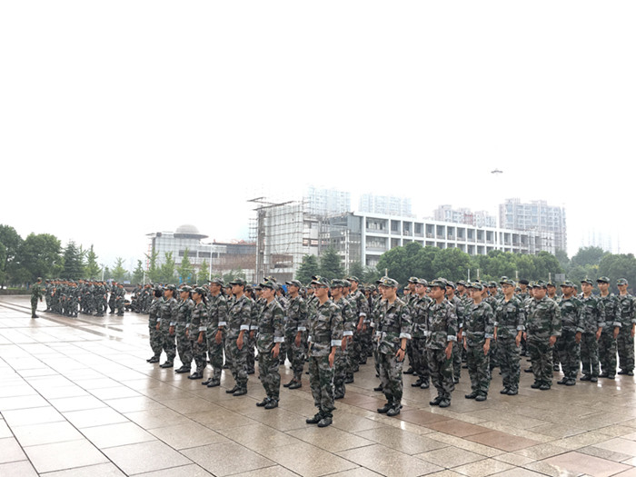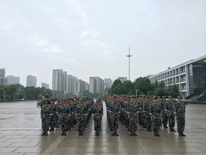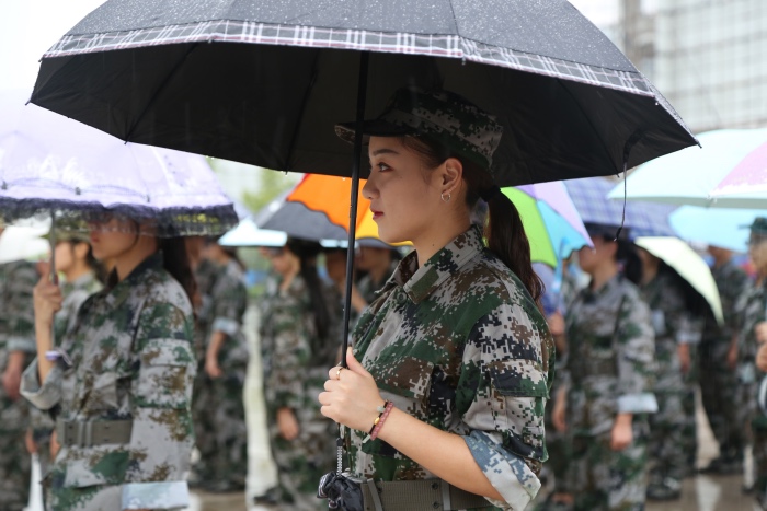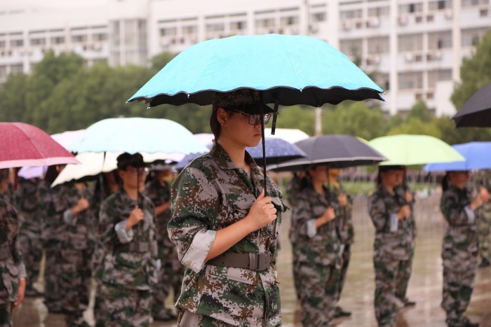 “自己求的雨,哭着也要淋完”。9月21日至9月30日,整个军训期间,天气大多都是阴沉沉的,时不时细雨纷纷。据军训同学回忆,训练时雨势若是变大,教官就会通知同学们撑伞避雨,而自己却保持训练姿势,站在没有任何遮挡物的雨中,任由雨滴打在他们的脸上,打湿他们的军装。中途有同学递伞给教官,也都被他们一一拒绝。难得的一天艳阳天,就让同学们燥热难耐,叫苦不迭。但他们似乎忽略了,其实大多时候是教官正对着太阳下命令、喊口号,而同学们训练的主要场地,大部分还有几分荫凉。17级各班的辅导员也同样是不辞辛劳,尽管工作繁忙,也要抽出时间陪着学生一起在阳光下暴晒,在雨中淋雨。早上早起,晚上加班,拉着一连队的学生进行训练,他们的良苦用心和以身作则看在了每一位同学的眼里。
