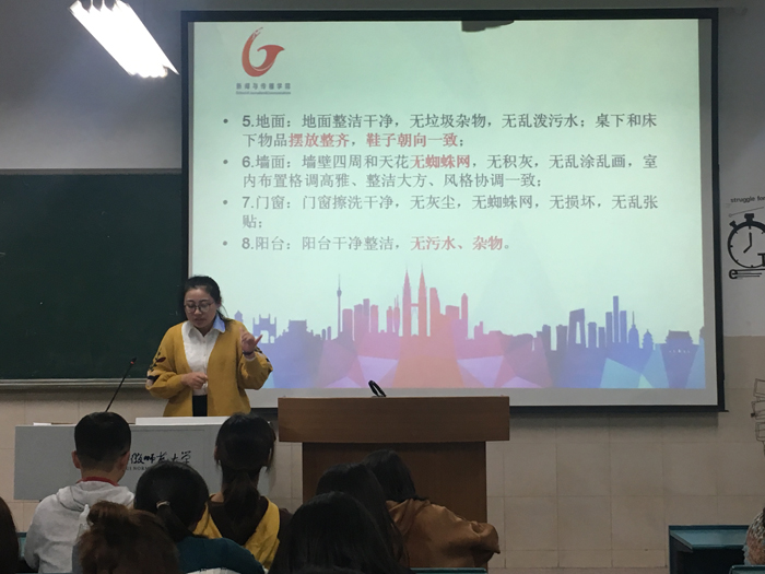 随后,张雁就《迎评期间学生宿舍文明检查内容》带领大家就宿舍环境卫生、宿舍安全隐患和宿舍文明文化方面带领大家逐条梳理,要求各班班委、寝室长、入党积极分子发挥带头作用。此次迎评工作是学校一项重要工作,希望借此机会督促同学们养成良好的学习和生活习惯。(文图/骆梦茹)