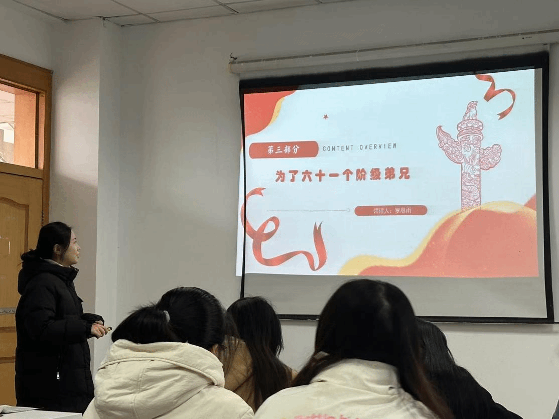 罗思雨同学带大家领读《中国青年报》历史上著名的事件通讯——《六十一个阶级兄弟》,她分别从内容概述、场面描写、文章结构等方面进行剖析,并表示文章采用倒叙的手法,抓住读者的阅读兴趣,营造出一种紧张的氛围。整篇文章结构合理,主题凝练,文章生动有趣。她还现场播放了同名电影的片段激发了参与者的兴趣。