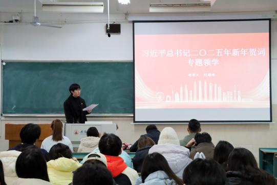 培训会伊始,支部纪检委员刘成俊做专题分享,他强调了入党积极分子培训对于端正入党动机、增强党员意识的重要意义,鼓励同学们珍惜学习机会,随后领学人刘赜玮带领同学们一起进行习近平总书记二○二五年新年贺词专题学习,新年贺词里有风雨彩虹,有大事小情,有人类命运,他强调要坚定传承红色基因、为共产主义事业不懈奋斗的决心,真正实现理论与实践的有机结合,做到知行合一。