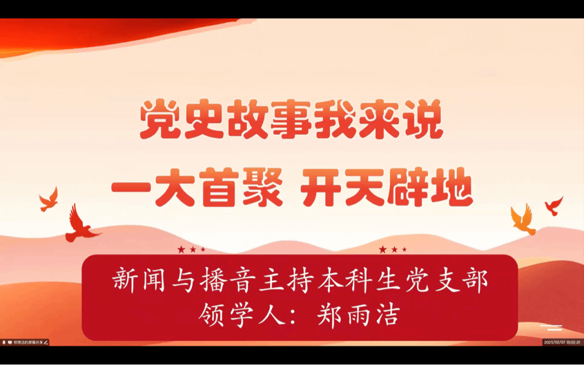 随后,来自2021级新闻学的三位支部党员代表分别领学了相关经典著作和理论文章。郑雨洁同志以“党史故事我来说—“一大首聚 开天辟地”为题,从唯物史观的角度回顾了中国共产党成立的历史背景与条件,生动讲述了中共一大历经艰难险阻最终成功召开的故事,并详细阐述了中国共产党成立的历史意义。她指出,中国共产党的成立是中国历史上开天辟地的大事变,使中国革命有了坚强领导核心、科学的指导思想、明确的奋斗目标和正确的革命道路。最后,她以中共一大的召开展望未来,鼓励大家坚定为实现中华民族伟大复兴的中国梦而努力奋斗的决心和信心。