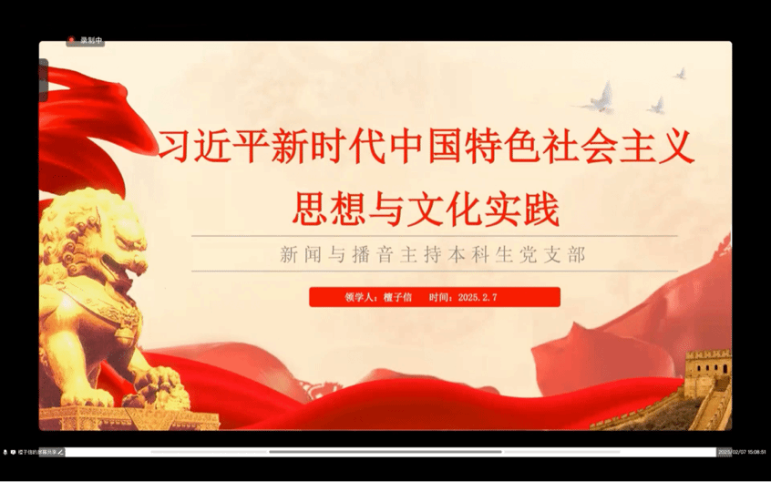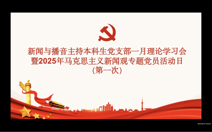 2025年2月7日下午,新闻与播音主持本科生党支部顺利开展了一月理论学习会暨2025年马克思主义新闻观专题党员活动日。本次会议由纪检委员刘成俊主持,党支部全体党员以及2022级、2023级部分入党积极分子参与了此次活动。会议围绕马克思主义新闻观的学习展开,通过领学经典著作和理论分享,进一步加深了支部党员对马克思主义新闻观的理解。