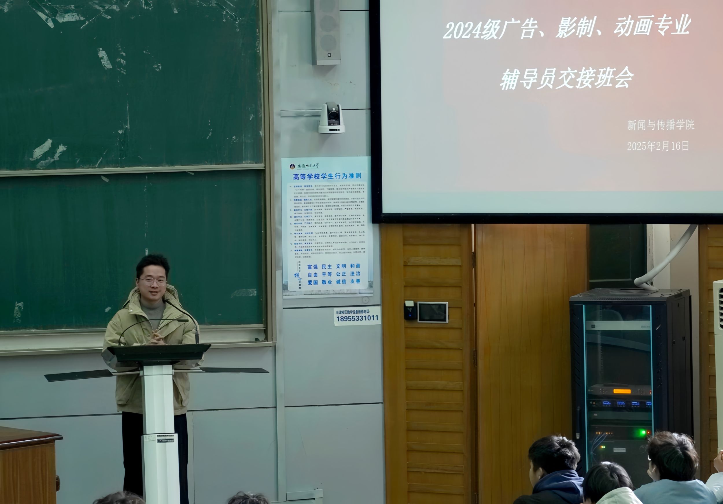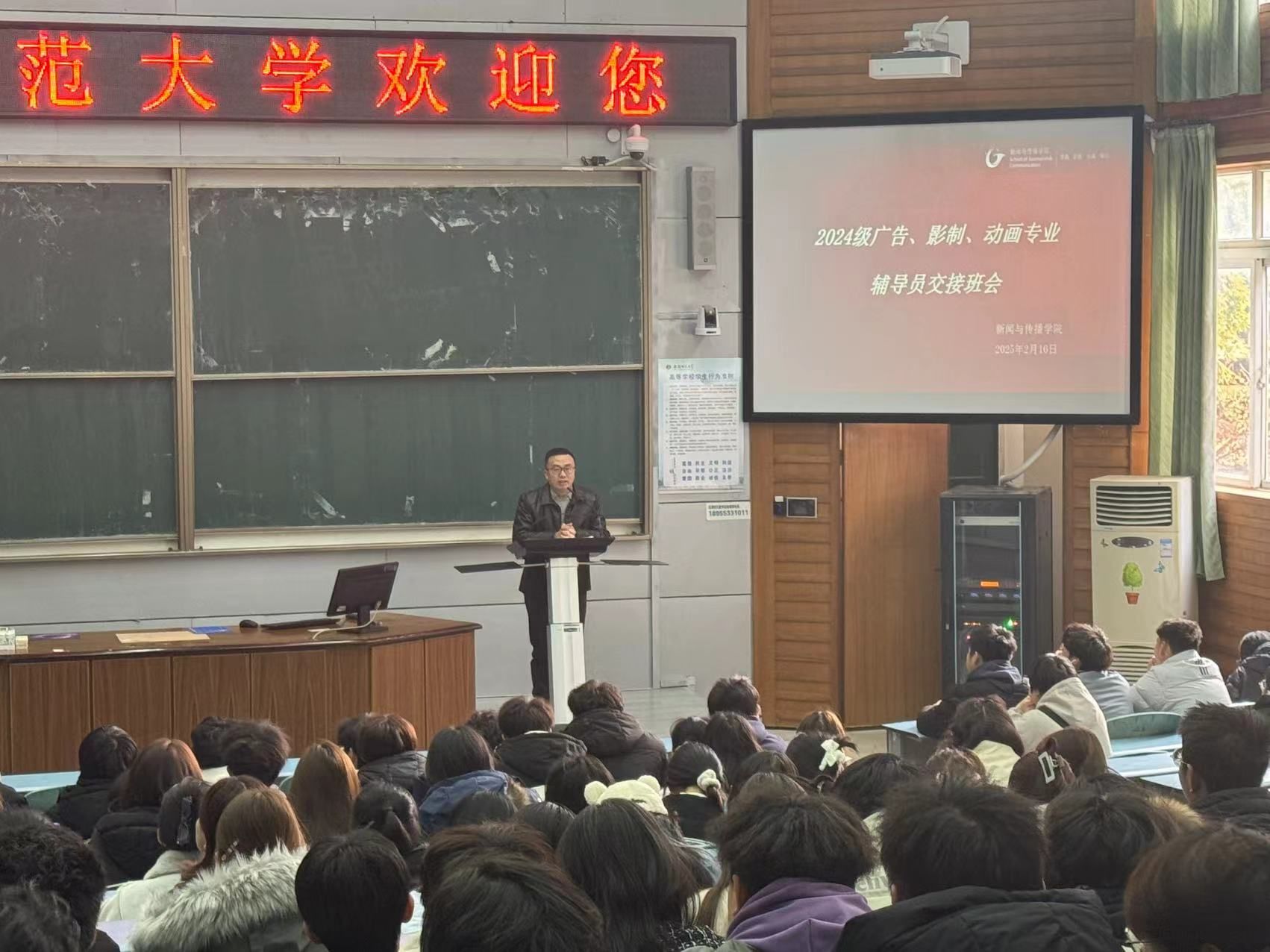 2月16日下午4时,学院在教学楼2010105教室召开2024级广告、影制、动画专业新老辅导员工作交接会。学院党委副书记吴青山、辅导员王旭、乌思琦以及2024级广告、影制、动画专业全体学生出席会议。会议由党委副书记吴青山主持。
