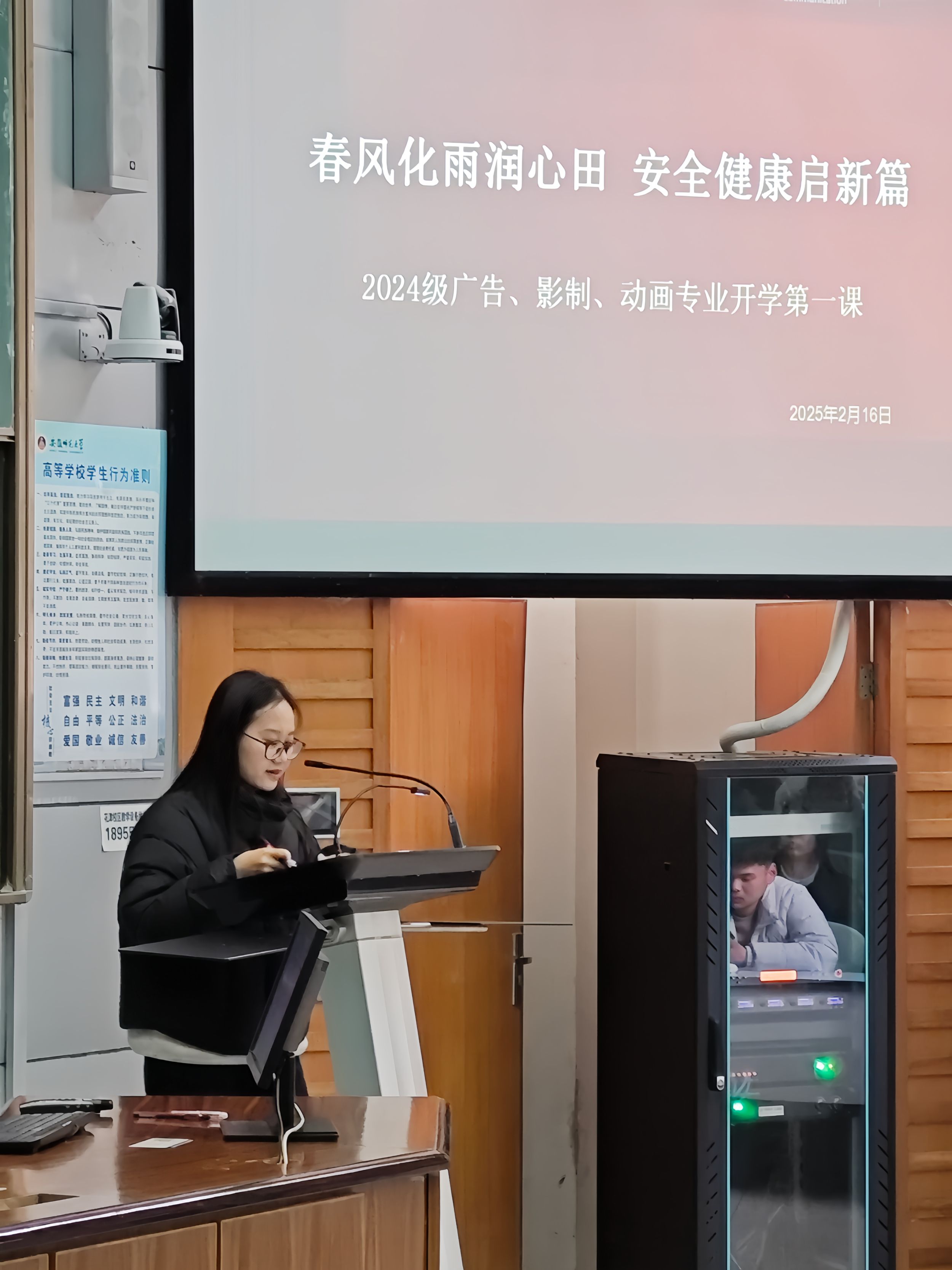 最后,乌思琦老师主持召开了以“春风化雨润心田,安全健康启新篇——2024级广告、影制、动画专业开学第一课”为主题的班会,重点围绕学风建设、疾病预防、安全教育和心理健康教育展开。在学风建设方面,她提醒学生关注补缓考时间,认真复习备考,严格遵守考风考纪,杜绝迟到、早退、旷课等现象。她通知了本学期的晚自习时间与地点安排,鼓励学生充分利用晚自习时间巩固学习成果。她强调,良好的学习习惯和自律意识是学业成功的关键,希望同学们在新学期中合理规划时间,积极参与课堂讨论与课外学习活动,全面提升个人综合素质,建议学生制定新学期学业规划,充分发挥宿舍学习小组的作用,互帮互助,共同进步。在疾病预防方面,乌思琦老师强调,当前正值急性呼吸道传染病和诺如病毒感染的高发期,学生需做好个人防护,保持宿舍卫生整洁、勤通风、勤洗手,并积极参加“阳光体育锻炼”,增强体质,提高免疫力。在安全教育方面,她提醒学生警惕电信网络诈骗、“校园贷”、“套路贷”等新型诈骗手段,凡是涉及金钱的陌生来电务必保持警惕。此外,她还就食品安全(减少外卖订购)、宿舍安全(严禁使用违规电器及不合格电器、严禁吸烟、落实晚点名)以及校园内外交通安全等方面进行了详细说明。在心理健康教育方面,乌思琦老师指出,从假期生活过渡到紧张的学习环境可能会带来心理不适,她鼓励学生积极寻求同学、朋友和老师的帮助,及时排解负面情绪,找到适合自己的压力释放方式。