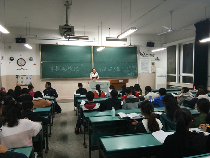 为迎接学校校规校纪考试,加强新生校史校情的学习,培养遵规守纪意识,养成文明健康的行为习惯,进一步形成优良校风、学风。11月6日晚,在学院楼 2050302教室17级网新、动画专业召开“学校规校纪,守规矩方圆”的主题班会。会议由辅导员张雁主持。