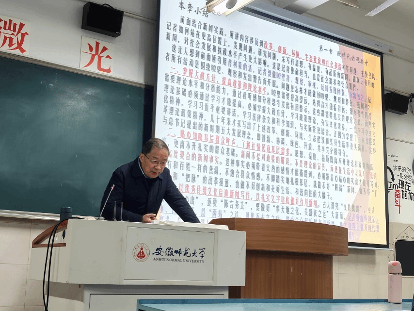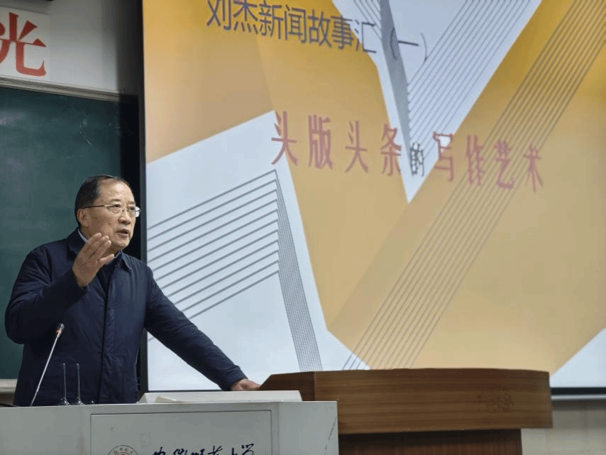 3月4日晚18:30,我校特聘教授、人民日报安徽分社原社长、高级记者刘杰在行知楼2050402教室开展“头版头条的写作艺术”专题讲座,新闻学主任张荻主持活动,2023级新闻学专业全体同学参与学习。