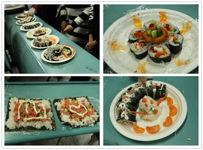 班级同学以寝室为单位,四人一组,在规定时间内,用给定的食材制作饭团,再由全班同学投票,得票最高的一组即为获胜。随着班级团支书的一声令下,同学们紧锣密鼓地动起了手,把胡萝卜切成丁,再把黄瓜切成条,摆放在海苔盖饭上,再小心翼翼地卷起来,最后浇上准备好的沙拉酱,之后还不忘了摆盘,这才算大功告成。同学们互相合作,互帮互助,教室里一片热火朝天的景象。班委同时不忘提醒每位同学小心地使用刀具,以防受伤。半个小时后,通过同学的投票,最终选出了最受欢迎的四个作品,同时取得前四名的同学获得了此次活动的小奖品。评选结束后,同学们开始享用自己亲手做出的饭团寿司,场面其乐融融,真实又有温度,更是有同学反映,这是她人生中吃过最好吃的饭团。