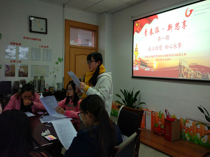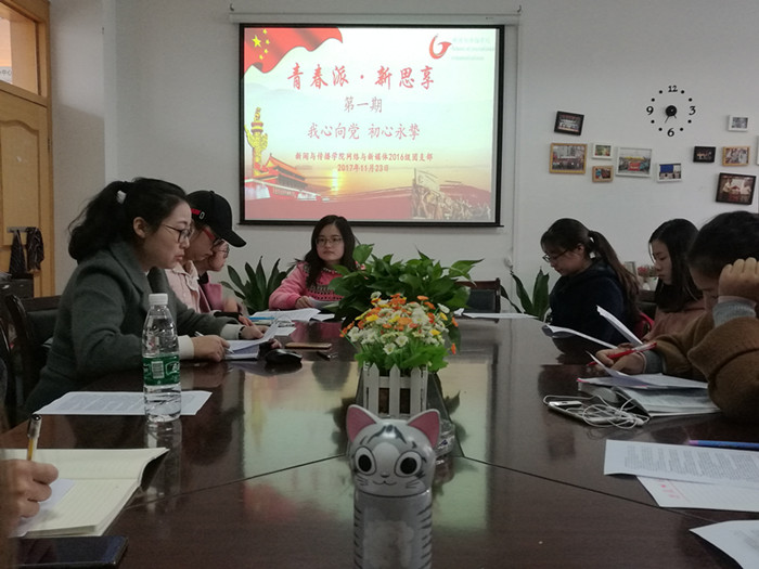 牢记使命,学子露真情;知行合一,学习十九大。2017年11月23日下午,2016级网络与新媒体团支部开展“青春派 新思享”系列沙龙第一期——我心向党,初心永挚。16级网新专业的辅导员张雁,班级预备党员、入党积极分子和团小组组长参与。学习会由班级团支书祝东秀主持。
