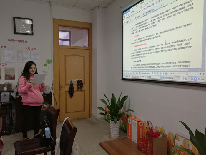 入党积极分子徐晓敏带着大家学习了十九大报告中出现不少的“关键词”,如“大会主题”、“中国共产党人的初心和使命”、“极不平凡的五年”等,展示了新理念、新观点,加深大家对十九大的认识与理解。