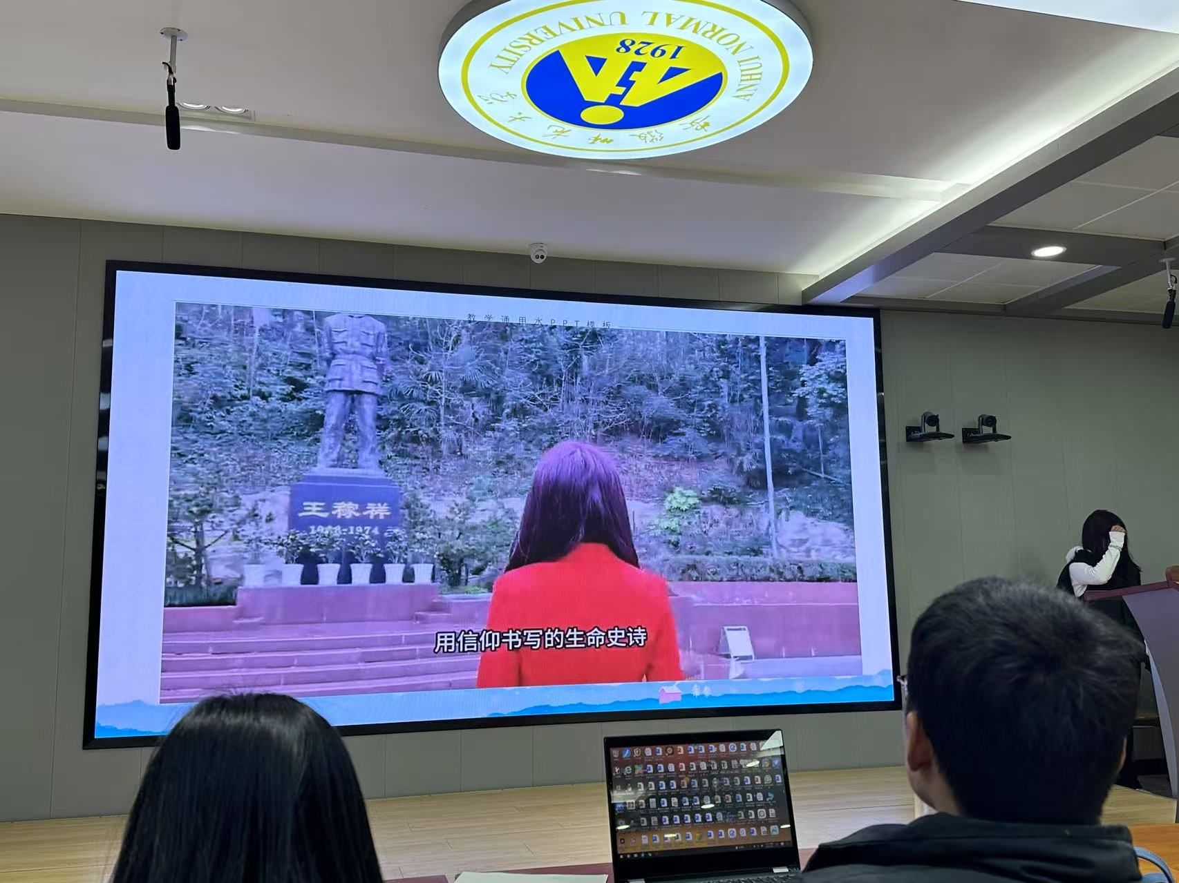 马鑫瑶同学结合在阜阳融媒体中心的实习经历,讲述了参与新闻短视频制作的流程。她与徐冰月、栗雅晴合作完成的“党史故事我来讲”系列视频《王稼祥的故事》,通过走访王稼祥纪念园、查阅地方志资料,将历史事件与人物精神融入镜头语言。活动现场播放了该视频片段,真实的历史场景与生动的叙事引发共鸣。