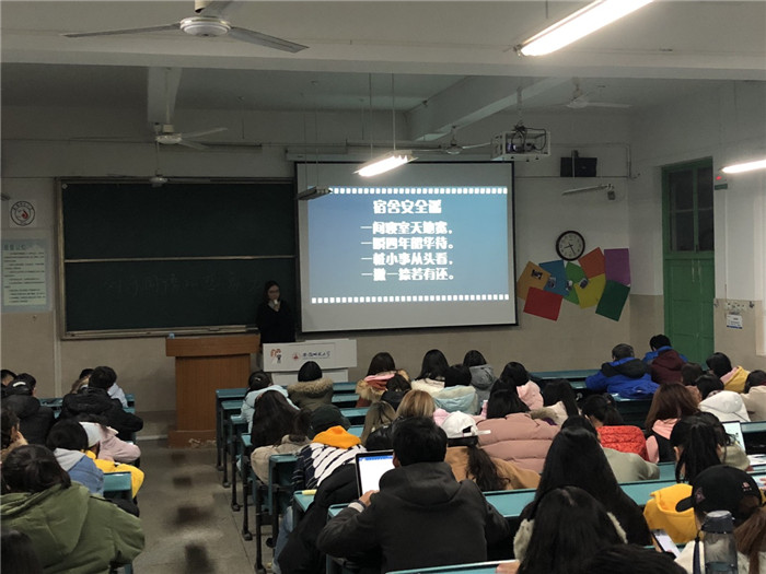 而对于住校学生来说,人身安全更需引起重视,很多安全还很凸显。以“2016芜湖跨年夜女大学生坠亡之谜”的命案为切入点,张虹将后续调查详细解说,用一段真实的案例向学生们展示了生命的脆弱,频频使人叹息。她指出“可以适度放松,但不能放纵。”,应该要以学校四项禁令为底线,不去触碰。同时,她提出要与寝室长达成协议,期望和拜托每一为寝室长担起责任,履行好义务。