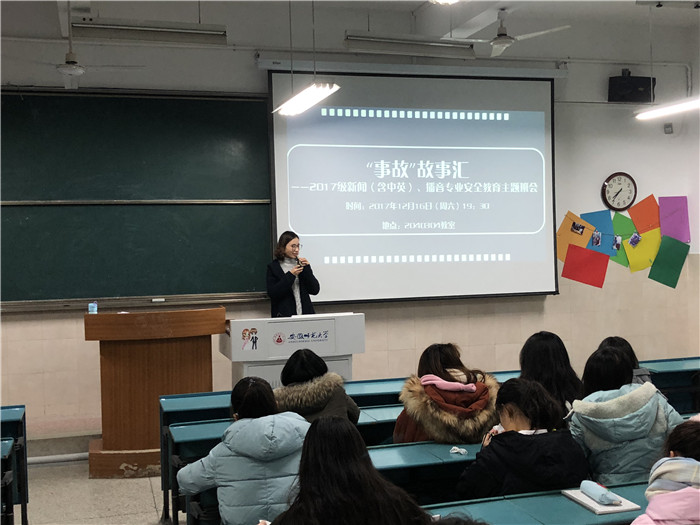 12月16日晚,2017级新闻(含中英)、播音专业在2040304教室召开了以“事故”故事汇为主题的安全教育班会,会议由辅导员张虹主持,全体同学参加。