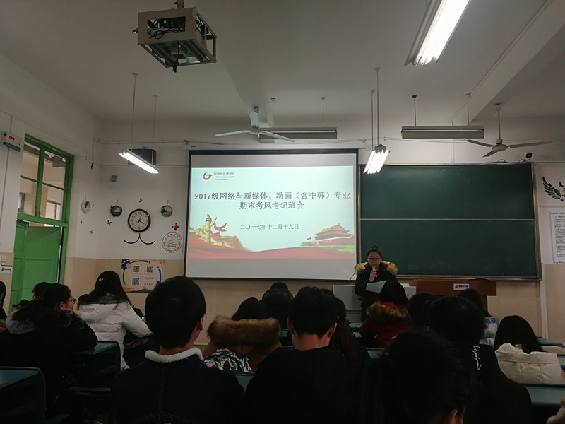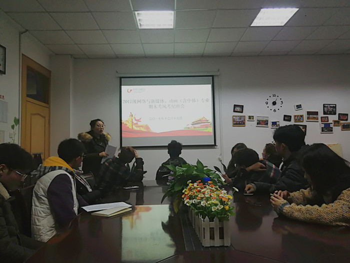 12月19日,2017级网络与新媒体、动画(含中韩)专业相继在教学楼和学院会议室召开了期末考风考纪主题班会。班会由辅导员张雁主持,专业全体学生参加。