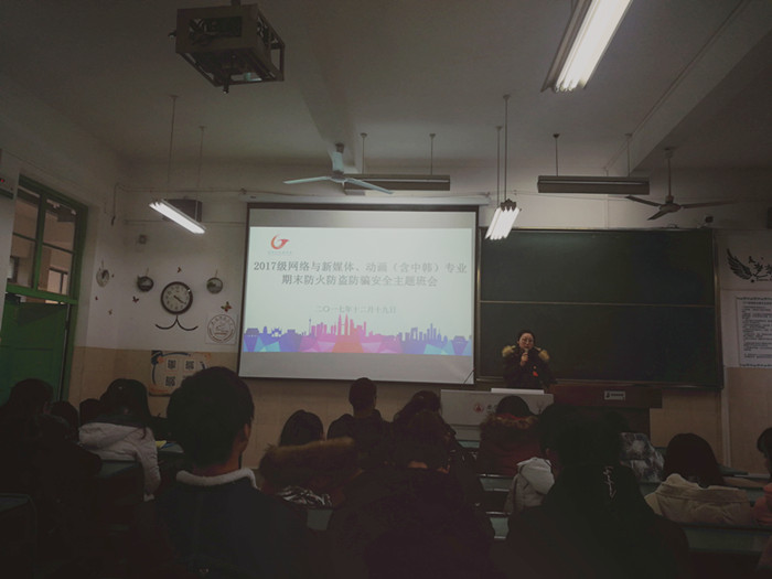 12月19日,学院17级网新、动画(含中韩)专业召开了防火防盗防骗主题班会。本次班会由辅导员张雁老师主持,各专业全体到场。